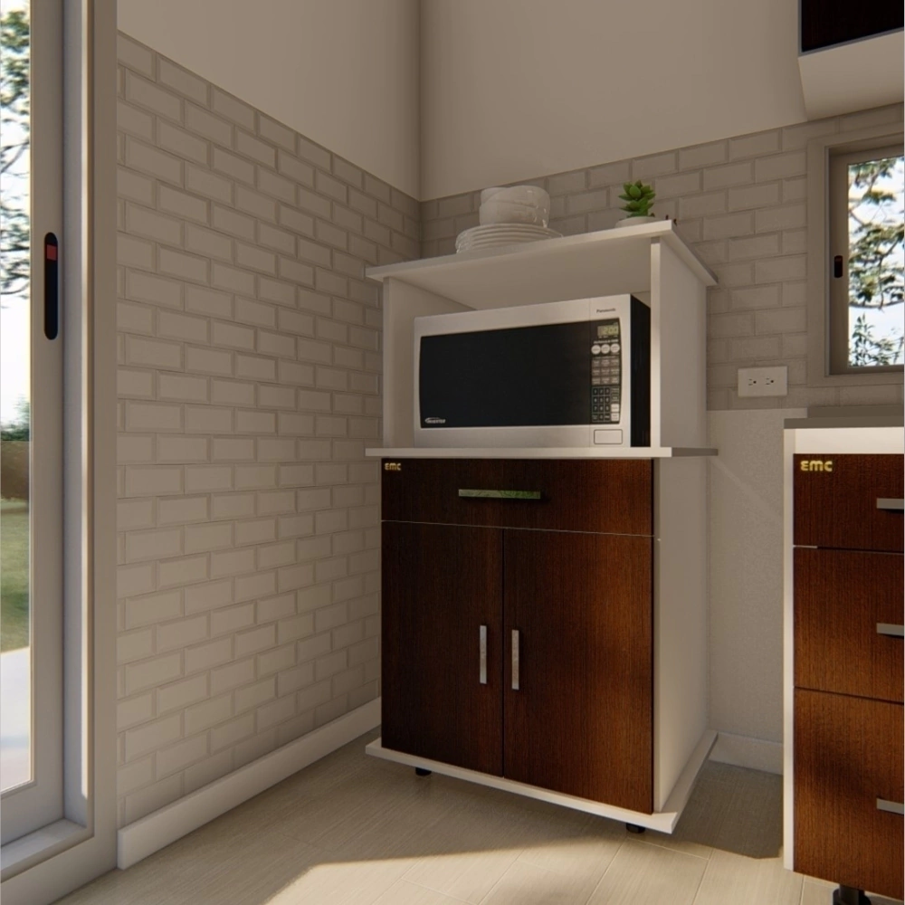 Fabricado en MDP de 15 mm con acabado en melamina, el Mueble para Microondas EMC es resistente y moderno. Incluye bisagras anti-apertura para un cierre seguro y patas antihumedad, garantizando durabilidad y estabilidad en la cocina.